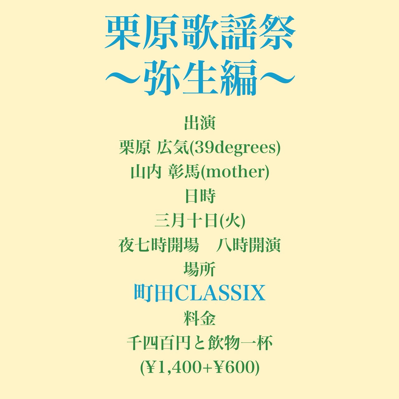 有原雅人と工藤竜也による春夏秋冬3ヶ月に一度開催されるアコースティックライブです。 CLASSIXバーカウンタースペースに特設されたステージで、 お酒を飲みながらライブを楽しんで頂くスタイルです。 本編ライブ終了後、24時迄そのまま会場内にて出演者共にお酒やフードをお楽しみ頂けます。